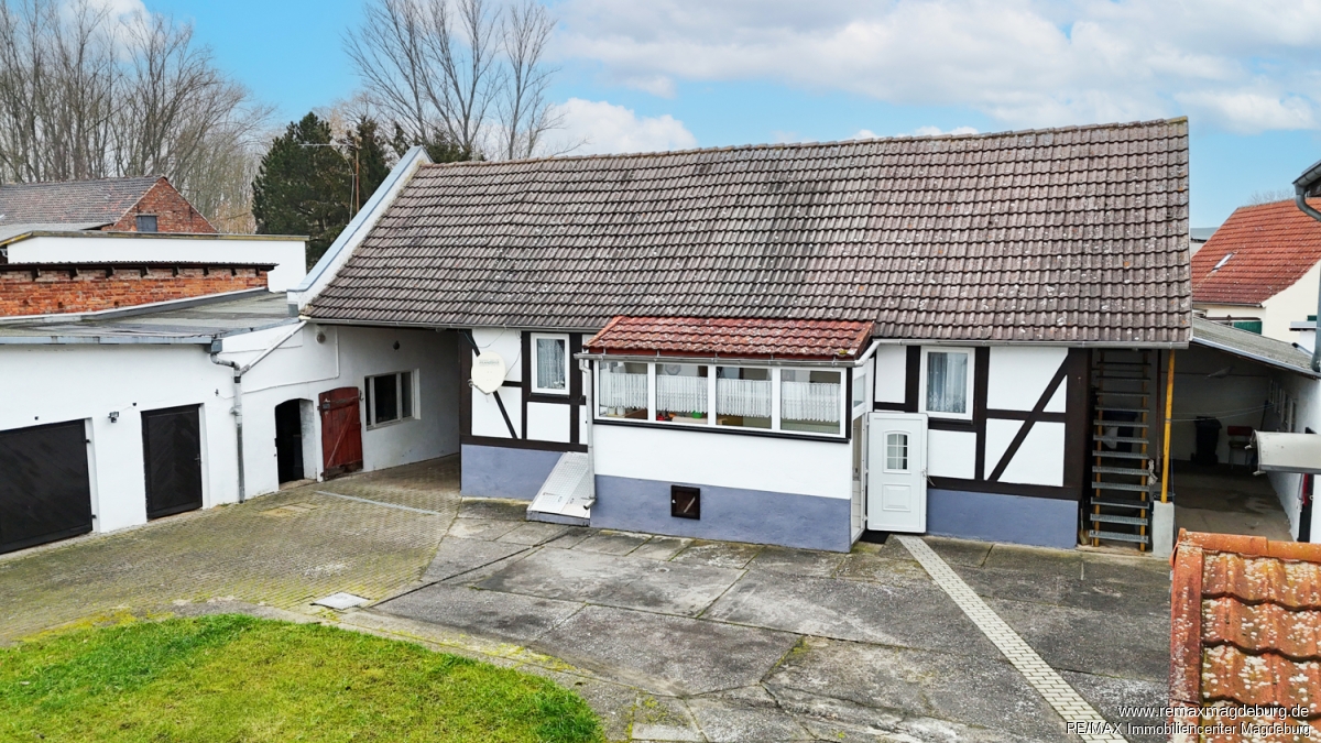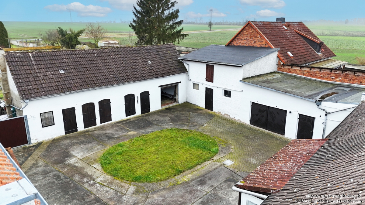 Der Innenhof verbindet beide Gebäude und bietet mit mehreren Garagen und Nebengebäuden viel Platz für Fahrzeuge, Hobbyprojekte oder eine Werkstatt. Das große Grundstück bietet Kindern viel Platz zum spielen und toben und nach Herzenslust können Obst- und Gemüse für den Eigenbedarf angebaut und Tiere artgerecht gehalten werden.