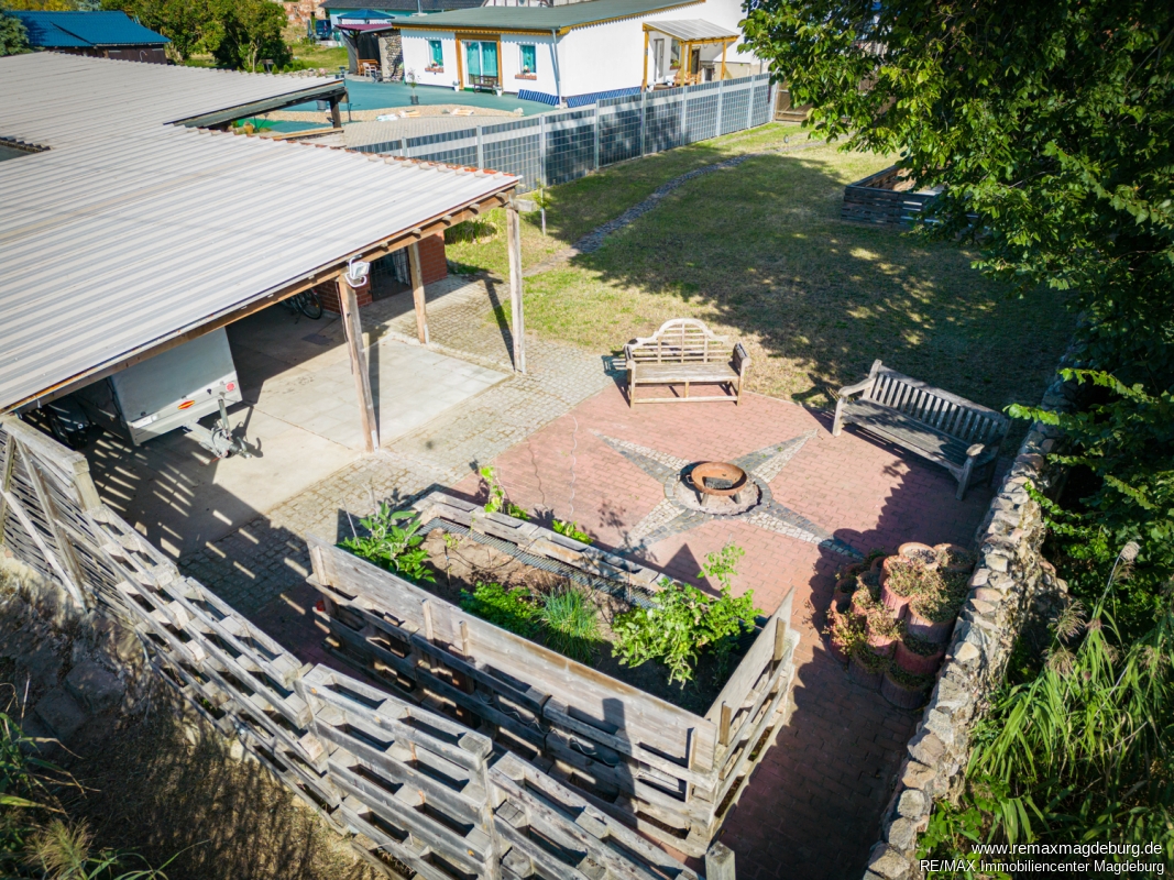 Auch im Außenbereich überzeugt die Immobilie mit zahlreichen liebevollen Details. Der gepflegte und umfriedete Garten lädt mit einer überdachten Terrasse samt Steingrill sowie einer gemütlichen, gepflasterten Feuerstelle zu entspannten Stunden im Freien ein. Innerhalb des Gartens befindet sich zudem ein Carport, das idealen Stauraum für Gartengeräte und Fahrräder bietet. Außerdem steht ein praktischer Hundezwinger bereit, der auch ideal als Abstellmöglichkeit genutzt werden kann.